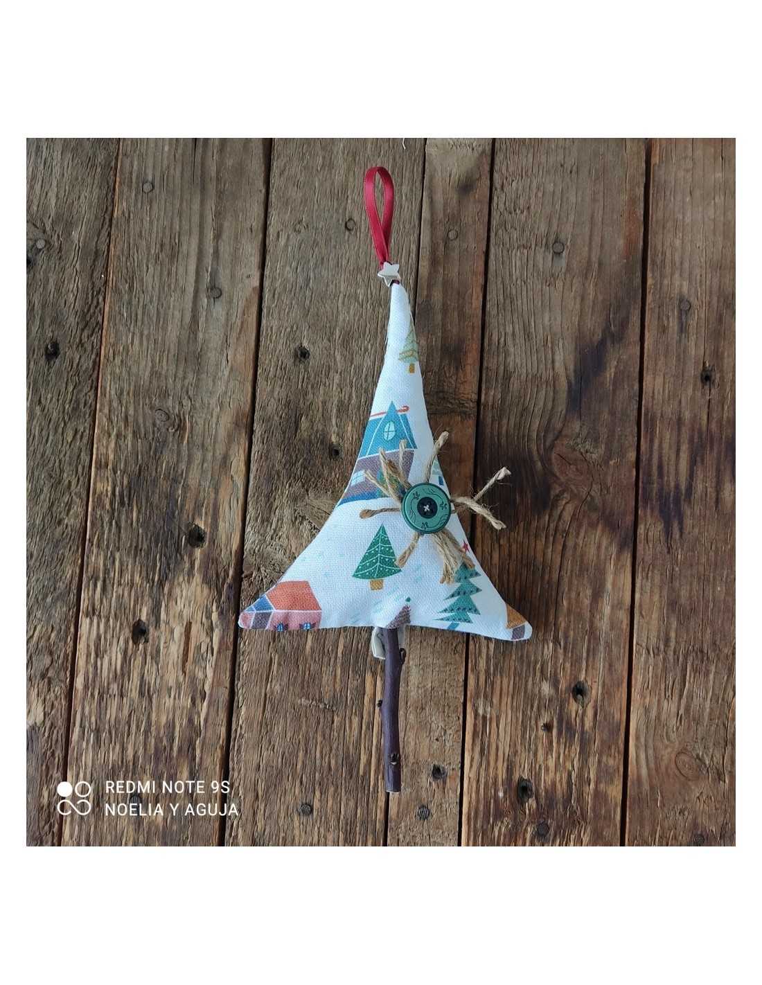 Arbolito de tela mullido, con cinta para colgar. Tronco de madera de almendro. Estrella de metal.