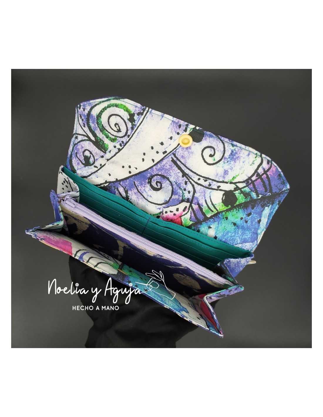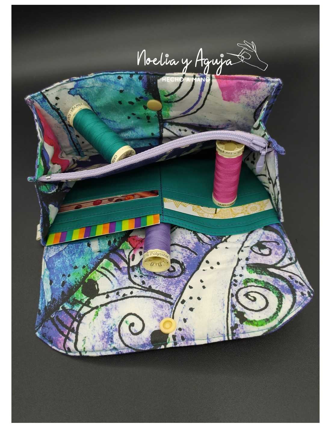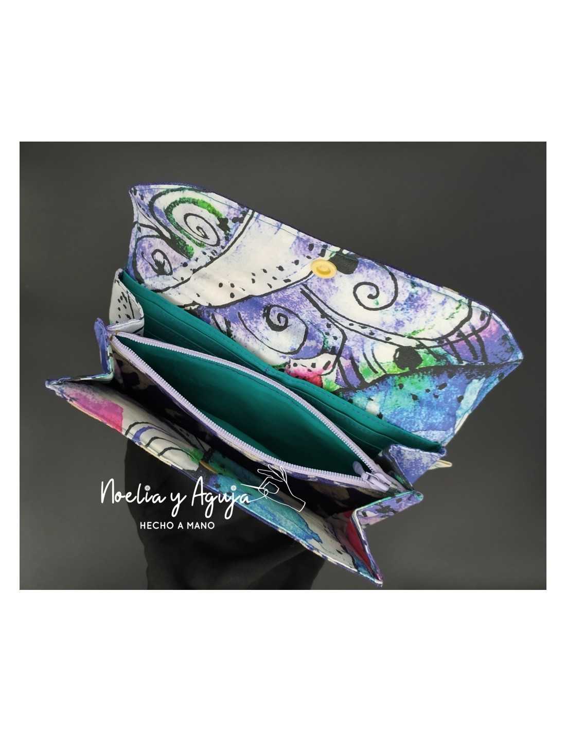 Monedero con fuelle, bolsillo interior con cremallera y bolsillo exterior con cremallera, distintos departamentos.