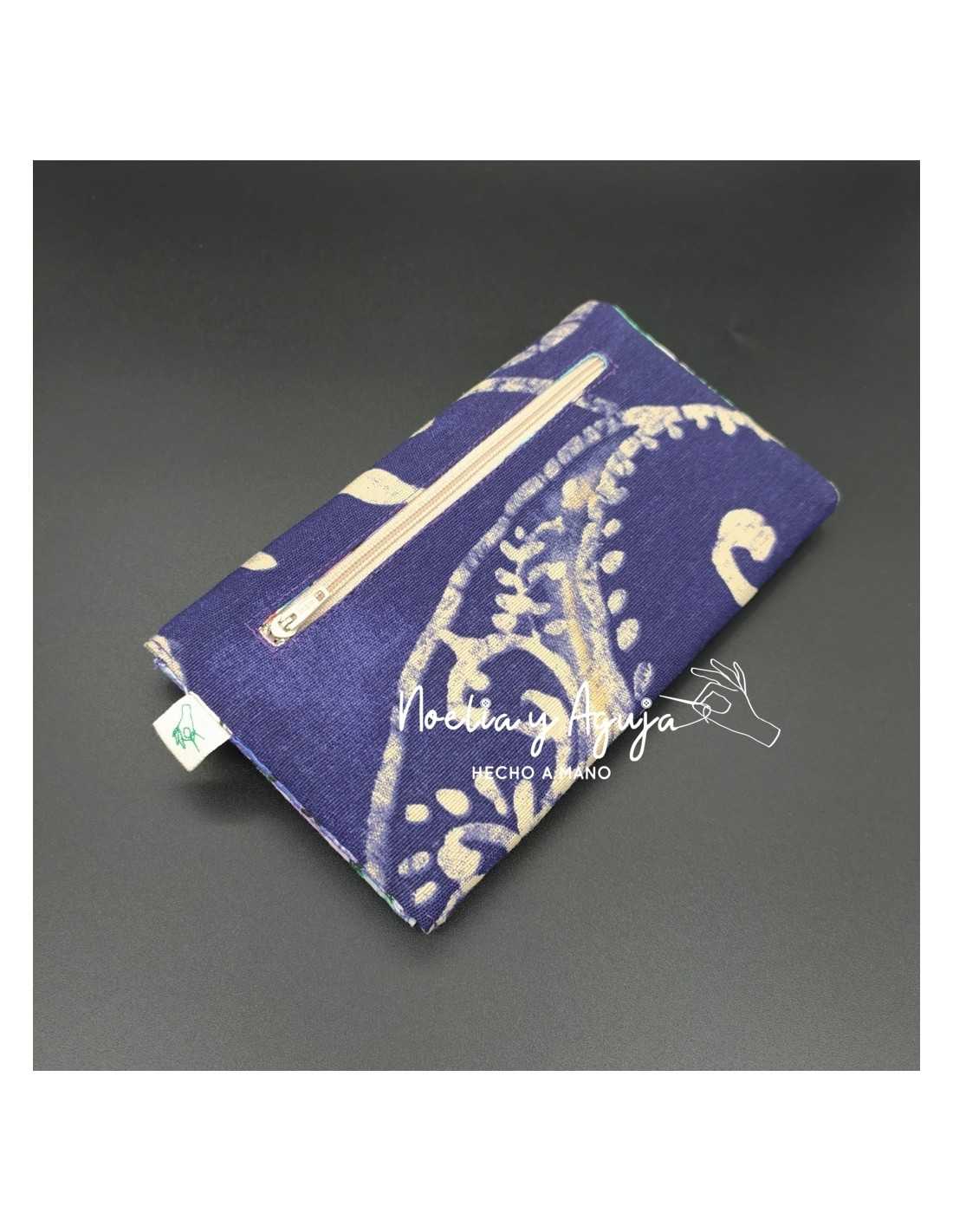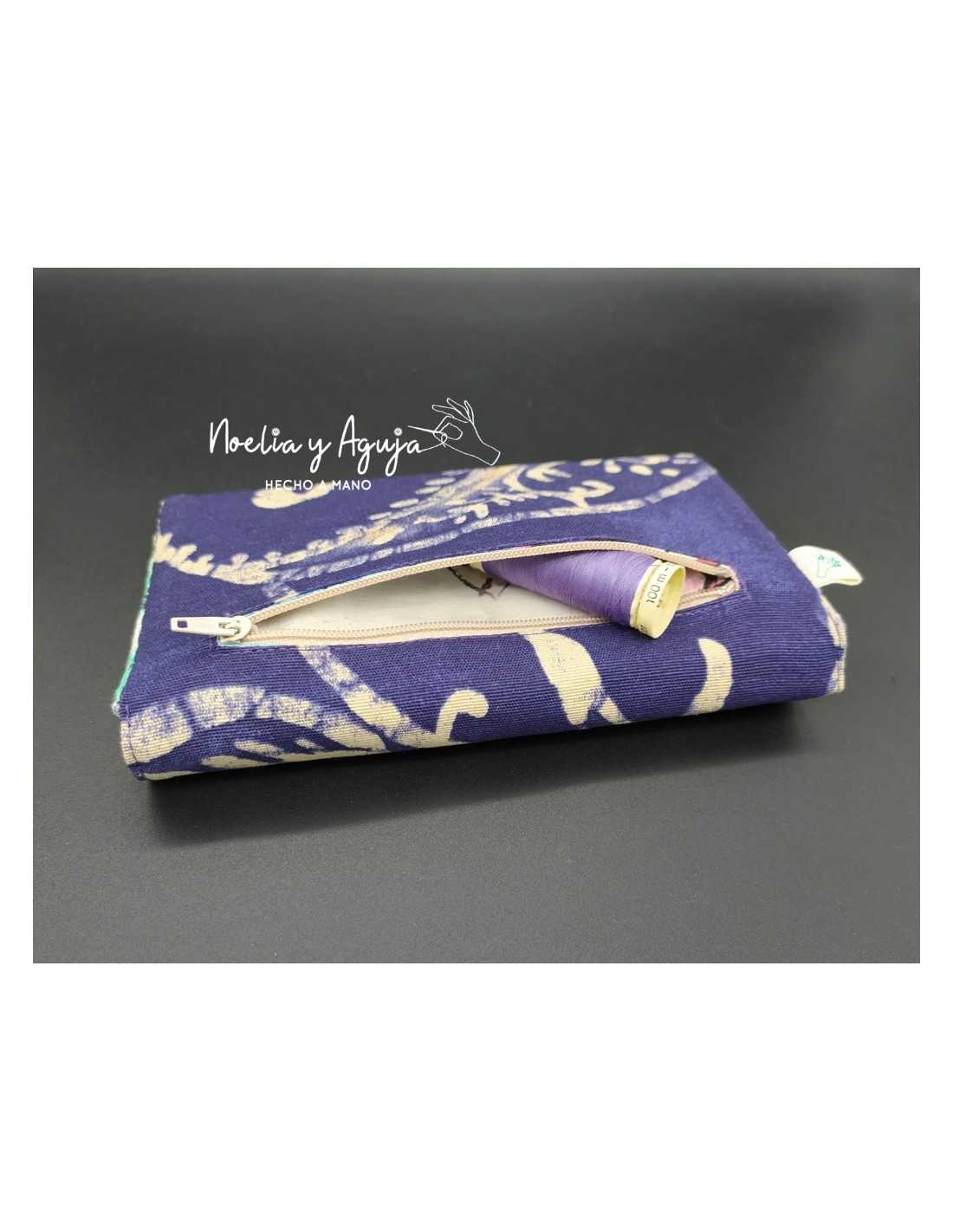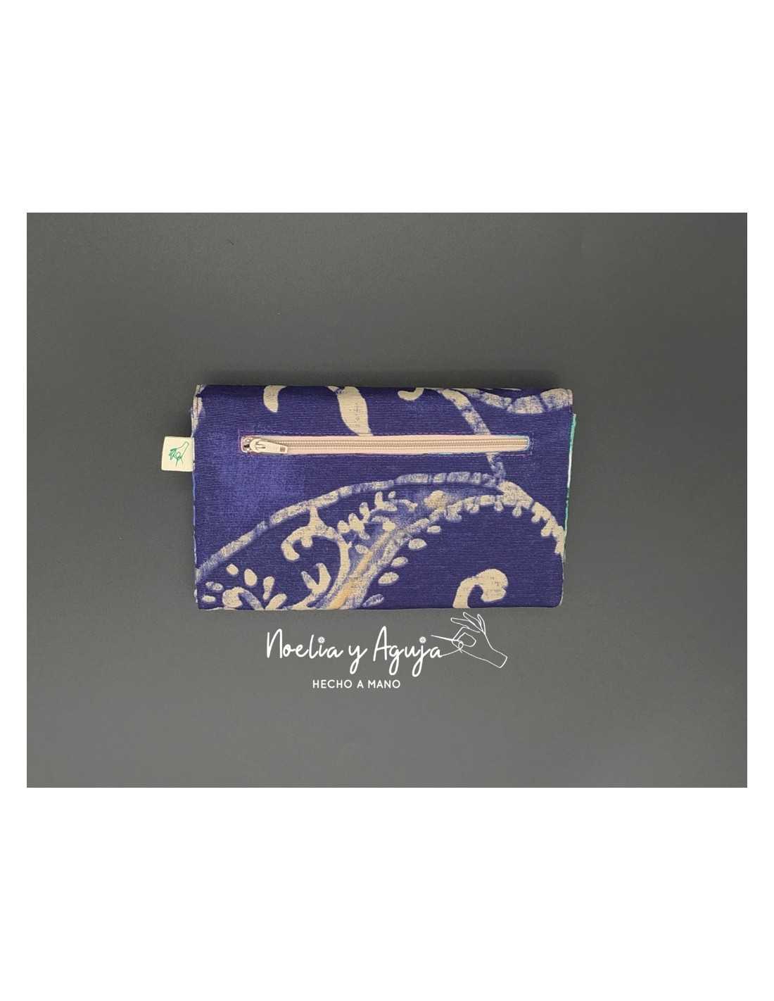 Monedero con fuelle, bolsillo interior con cremallera y bolsillo exterior con cremallera, distintos departamentos.