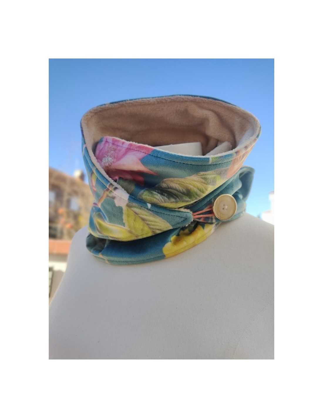 Cálido y supersuave cuello de tela aterciopelada en el exterior y tela de coralina en el interior con tono marrón y con cierre de botón.