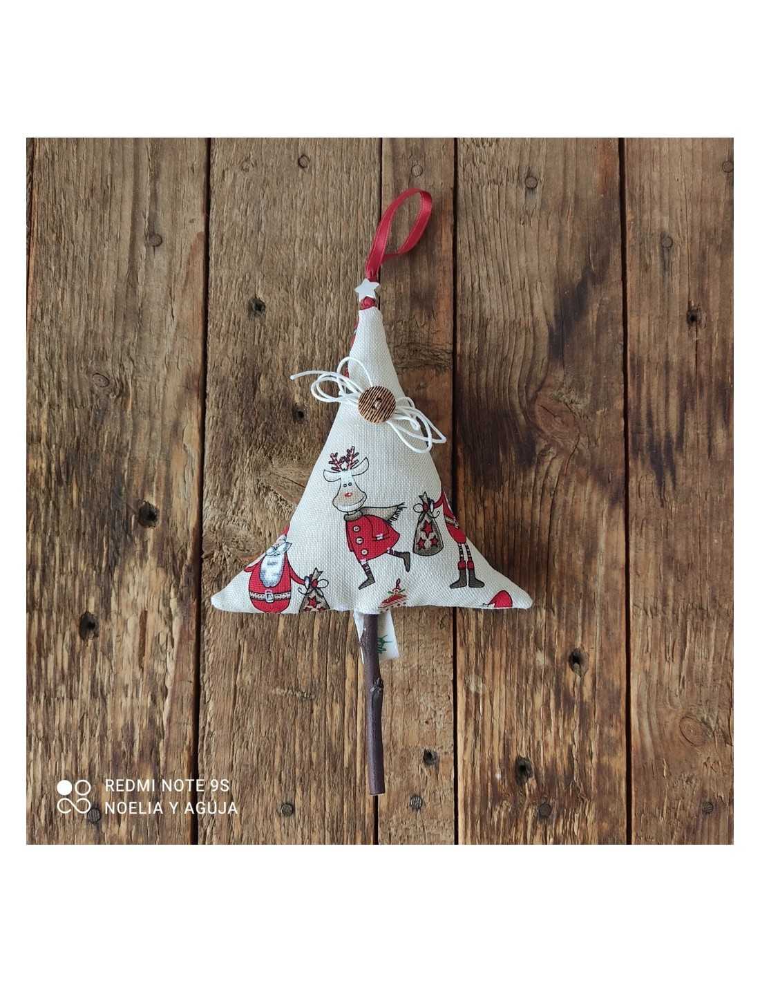 Arbolito de tela mullido, con cinta para colgar. Tronco de madera de almendro. Estrella de metal.