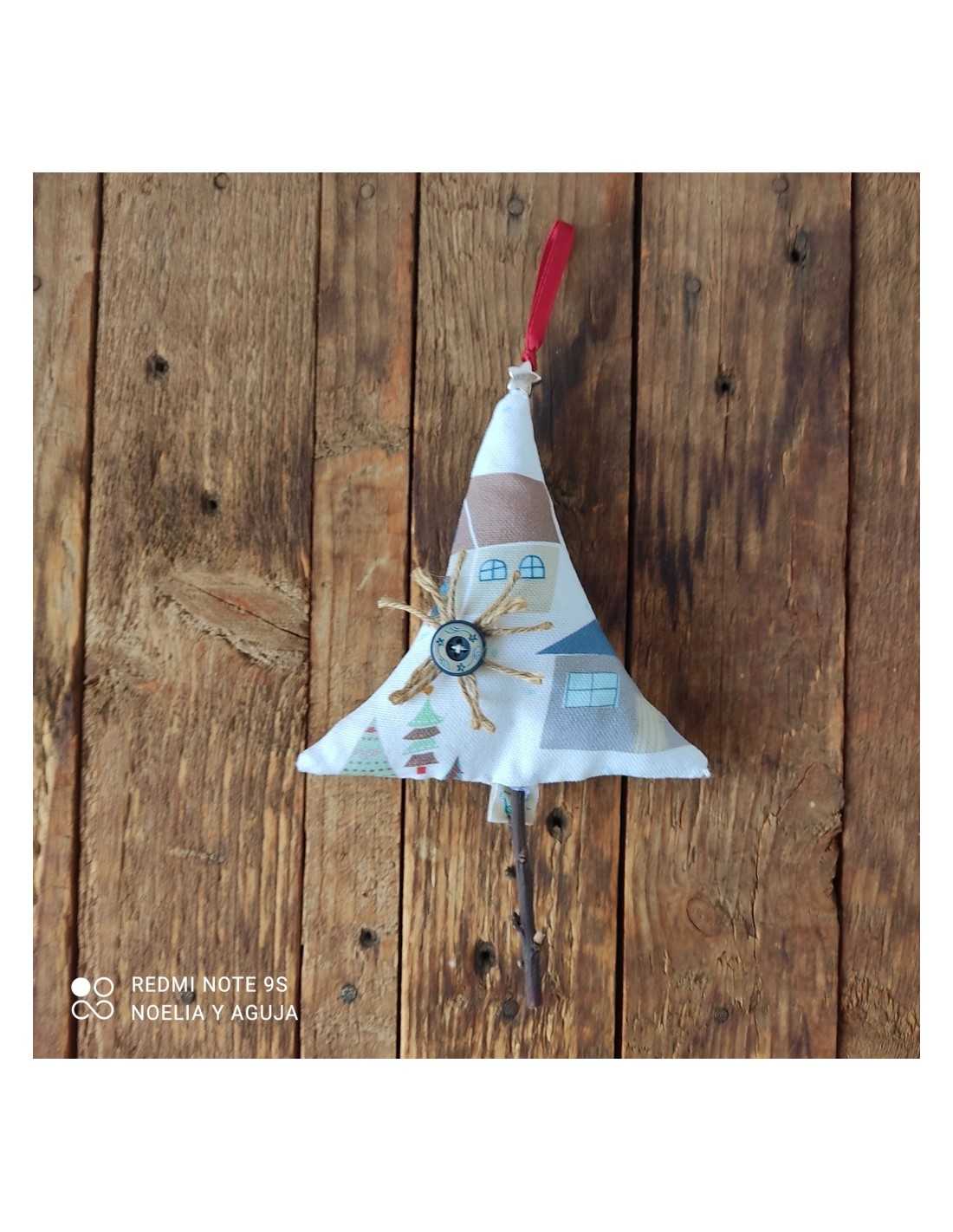 Arbolito de tela mullido, con cinta para colgar. Tronco de madera de almendro. Estrella de metal.